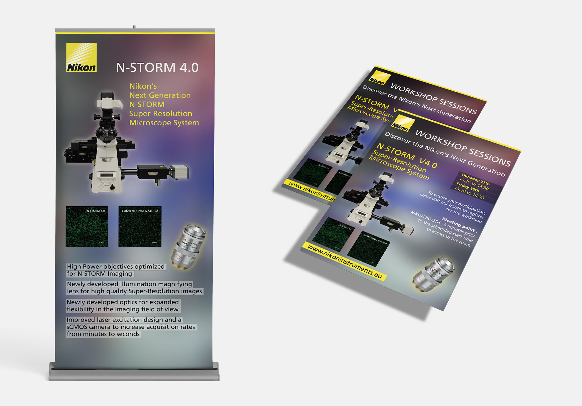 Création de roll-up et flyer pour présentation du nouveau modèle de microscope N-Storm, pour la société Nikon Instruments. (Paris - France)